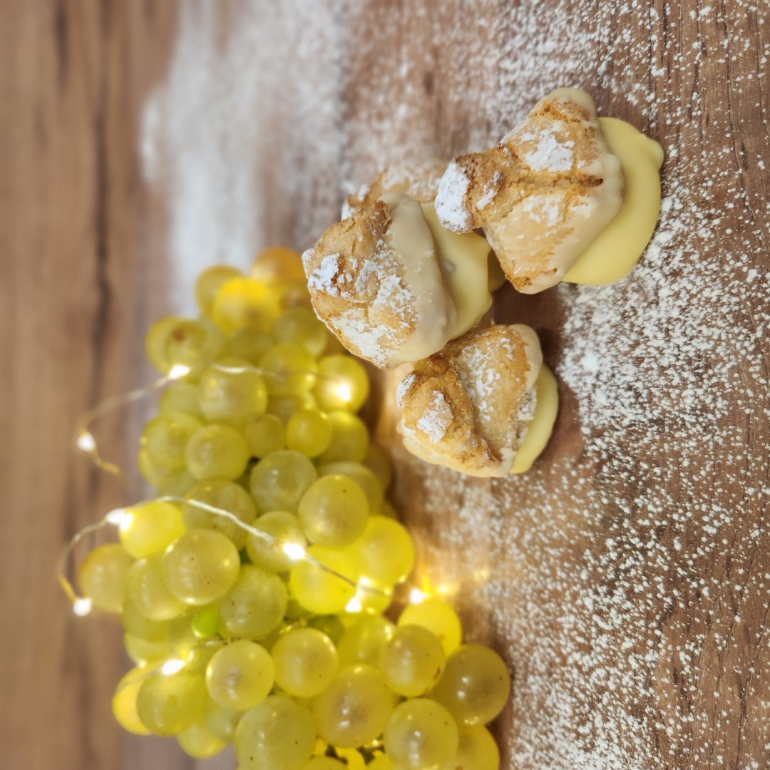Oben ein klassisches Amaretti. Zarte Marc de Champagner-Füllung mit feinster weissen Couverture überzogen.