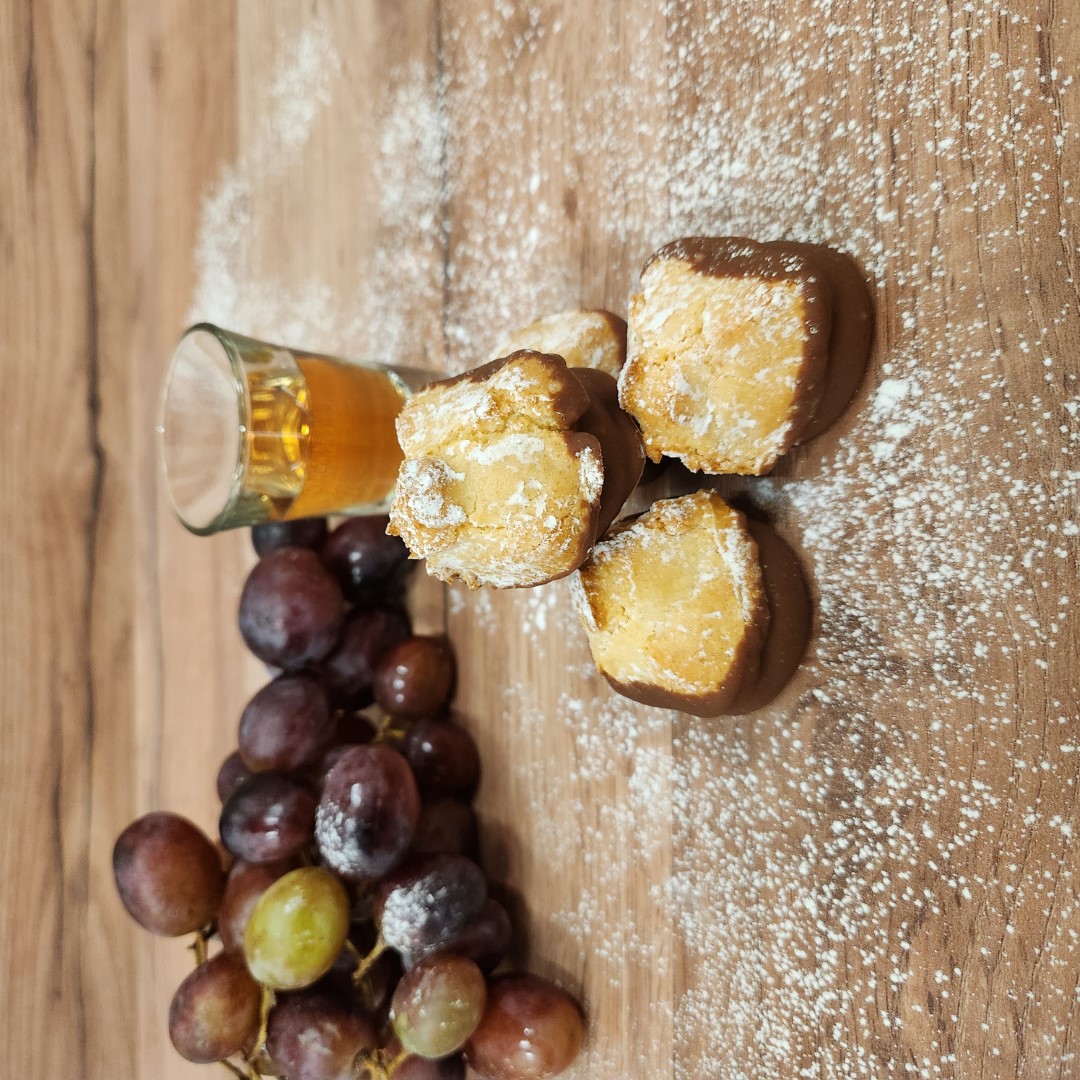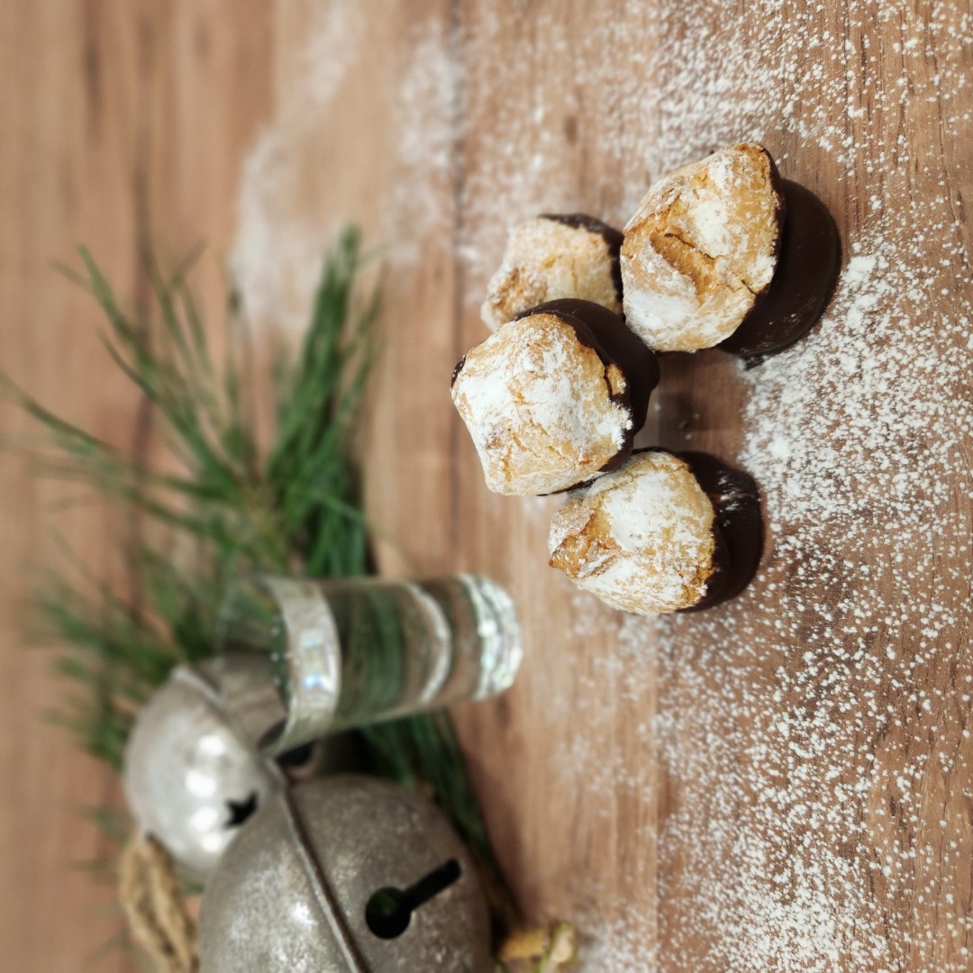 Oben ein klassisches Amaretti. Füllung aus feinstem Grappamousse mit Grappa aus dem Hause Ramazzotti und in edler Couverture getunkt.