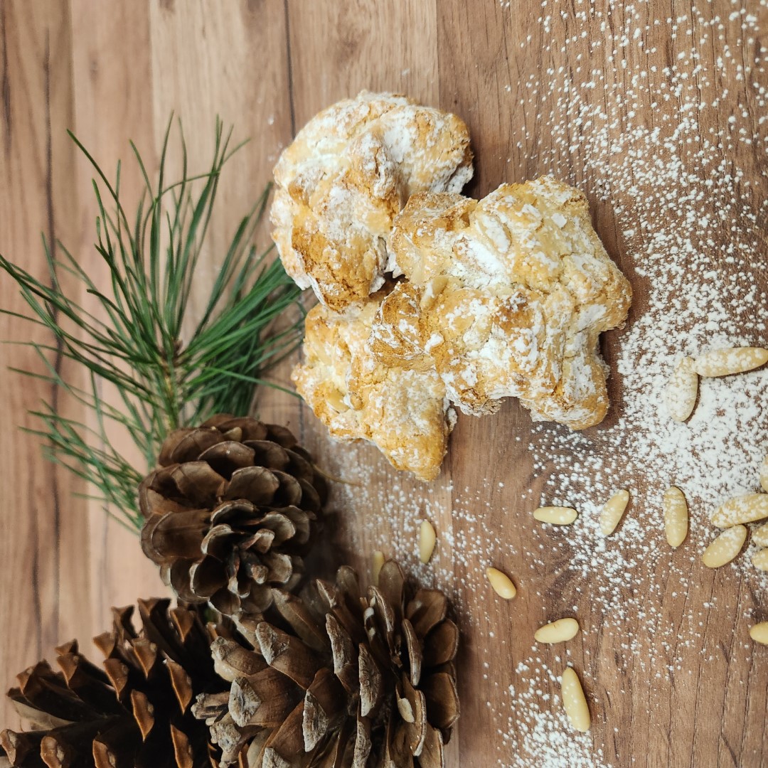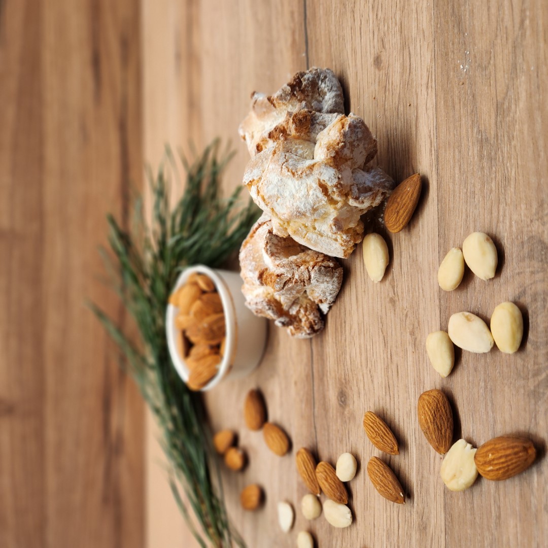 Oben ein klassisches Amaretti. Zarte Marc de Champagner-Füllung mit feinster weissen Couverture überzogen.
