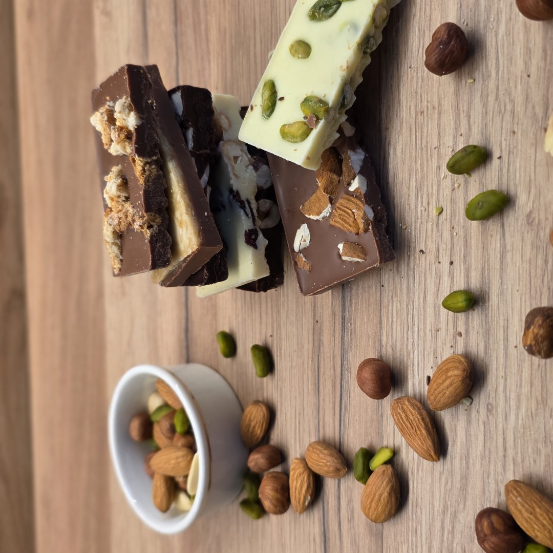 Unsere exklusive Grand Cru Bruchschokolade vereint drei köstliche Schokoladensorten zu einem einzigartigen Geschmackserlebnis.